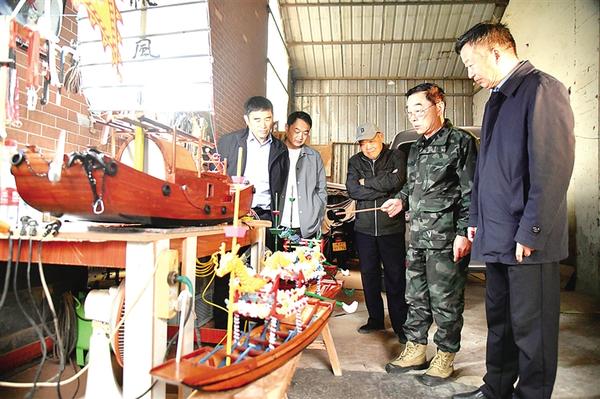 在造船工作室内,祁家造船传人祁新胜(右二)介绍造出的对联筏子货船。