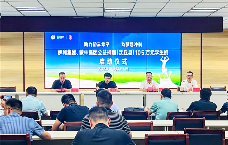 6月21日,伊利集团、蒙牛集团公益捐赠(沈丘)105万元学生奶启动仪式在沈丘县教体局举行。沈丘县教体局副局长郭宝珍、安全办主任刘志强,伊利集团、蒙牛集团学生奶(周口)推广中心负责人舒成、沈丘负责人黄知洪等出席仪式,各中心校校长和县直初中校长参加。