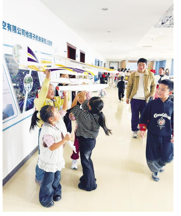 小记者近距离观察航模。近日,周口日报小记者部携手周报航空俱乐部,组织70余名小记者开展了一场别开生面的无人机科普研学活动,小记者在沉浸式体验中感受到了科技的魅力。