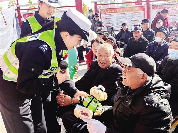 11月28日,民警将“交警小熊”送给一位村民。当日,商水县公安局交通警察大队组织民警、辅警,携手县豫剧中心走进汤庄乡西赵桥村,开展“美丽乡村行”交通安全宣传活动,通过营造宣传氛围,让群众自觉遵守法律法规,安全文明出行。