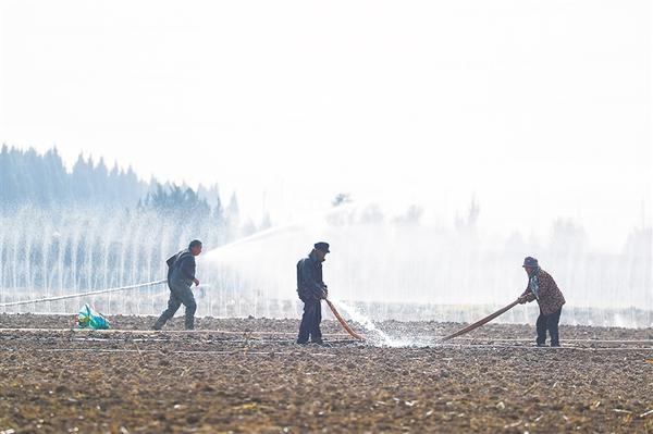 12月1日,在市城乡一体化示范区许湾街道蒋桥村,村民们正在灌溉麦田,为小麦越冬储备水分,确保苗情稳健。