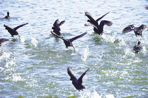 11月16日,在淮阳龙湖国家湿地公园,一群国家二级保护动物白骨顶鸡在此集结。