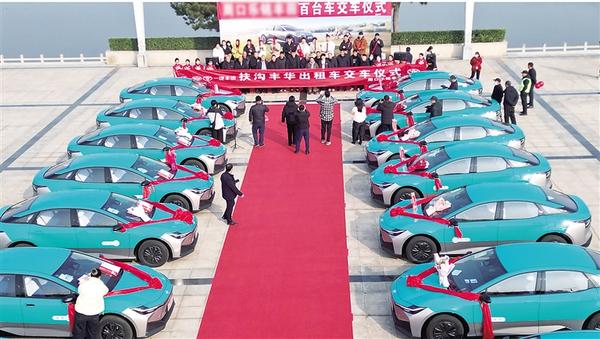 12月19日上午,周口和谐广场举行纯电动出租车交付仪式,一百辆全新纯电动轿车正式交付扶沟出租车公司并投入运营。