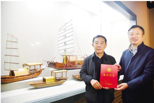 4月18日上午,周口市博物馆馆长周建山在市博物馆向祁新胜(左)颁发收藏证书。