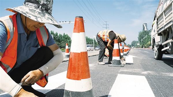 连日来,西华县华兴大道、中原路升级改造项目建设如火如荼。项目完工后,将进一步提升道路通行能力,助力城市“颜值”与品质双升级。图为工人在施工现场固定反光锥。