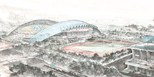 这幅作品以水墨写实的表现,将周口市体育中心的现代建筑之美定格在宣纸上,力求突出城市蓬勃的生命力。