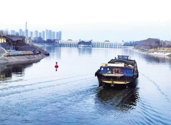 一艘货船缓缓驶过南寨历史文化街区大渡口,水波荡漾间,将千年古渡与现代航运相连。