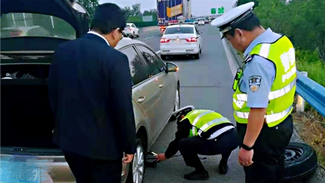 巡逻途中遇爆胎 交警动手解民忧