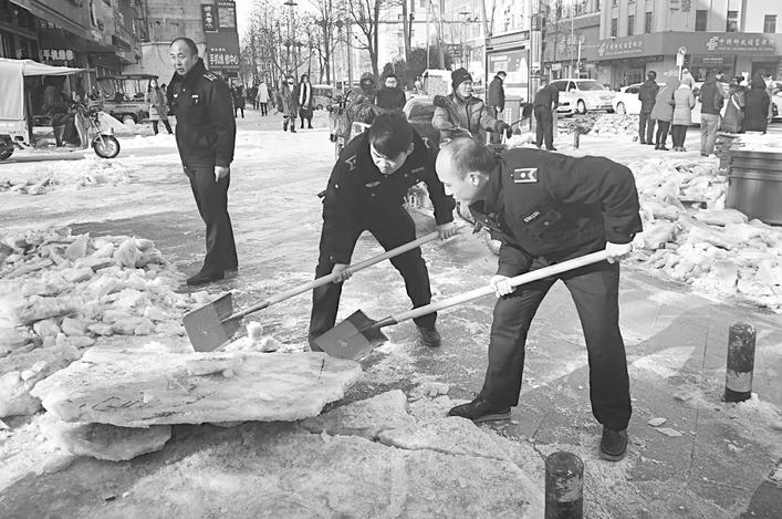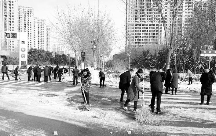 为了尽快消除冰雪对群众出行造成的影响,1月8日上午,周口市直各单位组织员工走上街头清除路面冰雪。②6