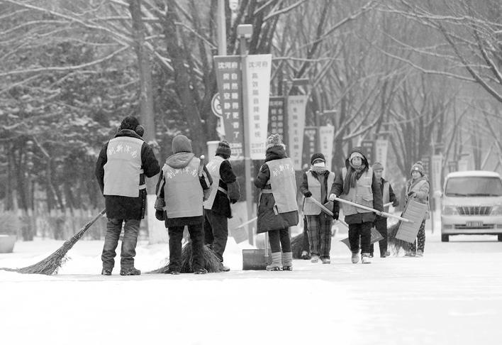 1月8日,沈阳环卫工人清理街头积雪。当日,东北地区多地迎来新一轮降雪天气。新华社记者 李钢 摄