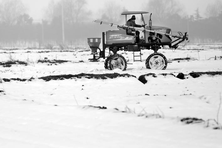 1月8日,江苏省淮安市盱眙县古桑街道白虎村农民驾驶机械在雪后的麦田施肥。日前,江苏省淮安市盱眙县降下冬雪,当地农民纷纷抢抓墒情,及时为小麦施肥,促进小麦弱苗转壮。新华社发