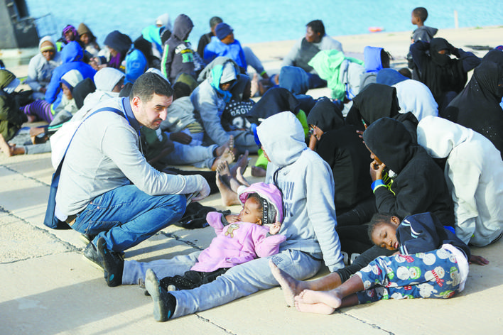 1月7日,在利比亚的黎波里一海军基地,获救的非法移民接受救助。