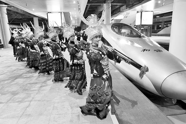 1月25日,在贵阳北站,苗族同胞载歌载舞庆祝渝贵铁路全线开通。