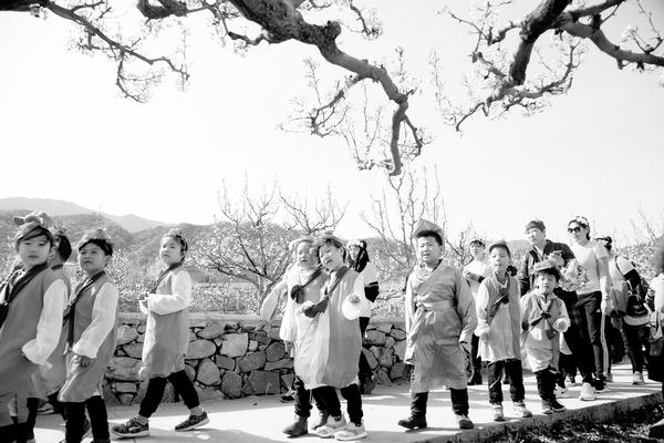 4月10日,小朋友们在老师的带领下走进梨园赏花。当日,第四届梨花乐跑节在千亩梨花盛开的北京市门头沟区军庄镇孟悟村举办,“品梨花古韵 赏京西美景”主题活动吸引众多游客前来体验。新华社发