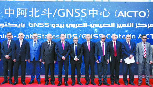 4月10日,在突尼斯首都突尼斯市北郊贾扎拉科技园内,阿拉伯信息通信技术组织秘书长穆罕默德·本·奥马尔(左五)等嘉宾出席中阿北斗中心揭牌仪式。中国北斗卫星导航系统首个海外中心——中阿北斗中心10日在位于突尼斯的阿拉伯信息通信技术组织总部举行揭牌仪式。新华社发