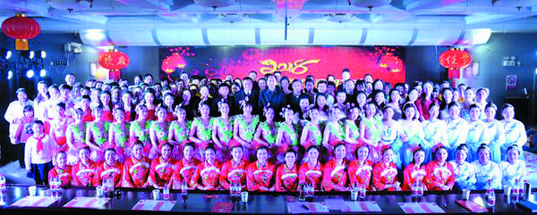 周口市中医院2018春节联欢晚会结束后,市领导上台与该院护理团队表演人员合影留念。