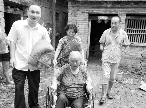 郸城县白马镇胡寨行政村积极开展“接老人回家”活动,既解决了老人居住环境问题,又使老人在生活上得到照料,确保晚年住得安心、生活舒心。8月份以来,该村已接6位老人回家。图为8月9日上午,市商务局驻胡寨行政村第一书记郭景鑫和胸戴红花的“好媳妇”一起接老人回家。