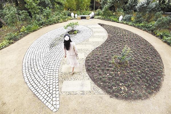 坐落于剑桥大学徐志摩诗碑旁的“徐志摩花园”10日在第四届剑桥徐志摩诗歌艺术节上正式向公众开放。这是剑桥大学历史上第一座修建在校园内的中式花园,设计中融入了中国道教和佛教理念,花园中央是以黑白石子砌成的阴阳图案,一条刻有《再别康桥》中英文诗文的小径从“阴”“阳”中穿过。 新华社发
