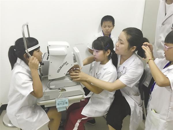 近日,沈丘县光明眼科医院开展“小小眼科医生”体验活动,邀请孩子们走进医院,体验眼科医生的工作,认识保护眼睛的重要性,了解保护视力、预防近视的方法。图为在特检医生的指导下,“小小眼科医生”正在为小伙伴做检查。