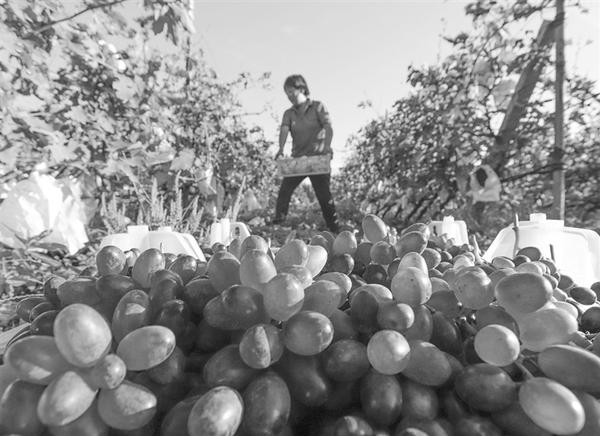 9月24日,河北唐山遵化市团瓢庄乡山里各庄村农民在采收葡萄。金秋时节,河北唐山遵化市的农民抢抓农时,采收成熟的果实,进行作物管护等农事活动,田间一片忙碌景象。 新华社发