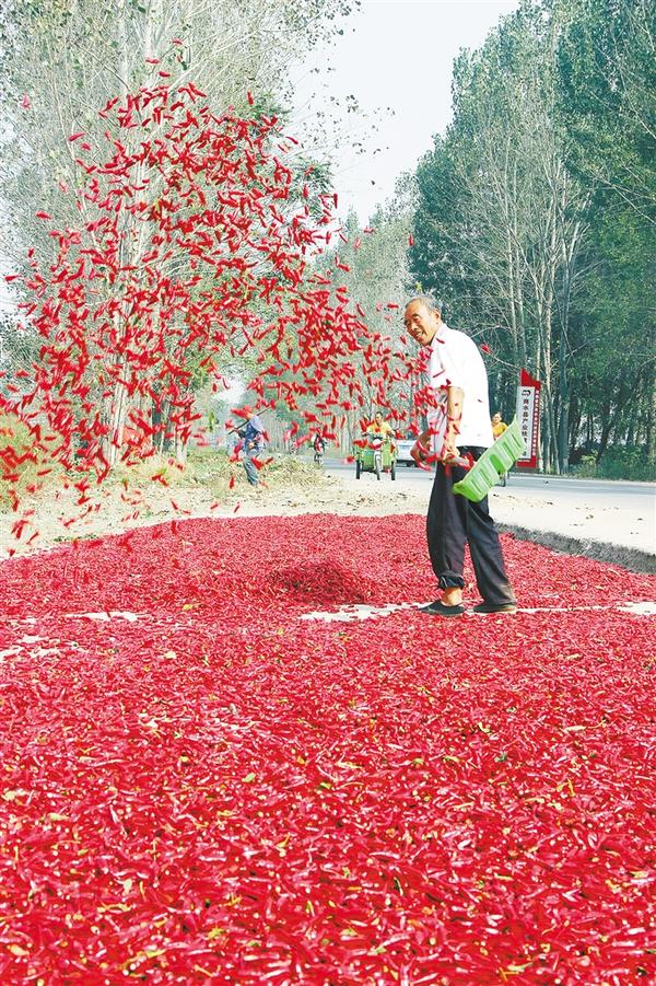 近年来,商水县郝岗镇大力实施辣椒产业扶贫,通过党员干部带动、结对贫困户扶持发展,种植万亩以上小辣椒,实现亩效益3000元以上,促进了群众增收致富。图为昨日上午,该镇西洄行政村农民正在晾晒小辣椒。