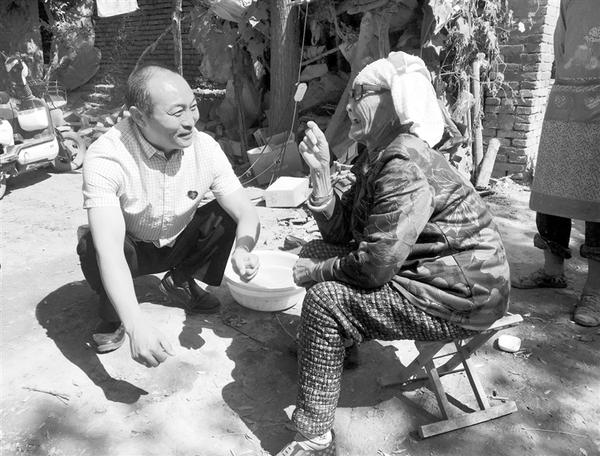 9月30日,爱心企业家方凯来到西华县东王营乡朱营行政村,为他资助的10名贫困学子之一——朱新宇送来一些生活必需品,以解其生活上的燃眉之急。图为方凯向朱新宇的奶奶询问家庭生活情况。②5记者 孙智 摄