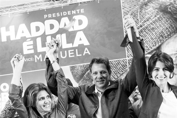 10月7日,在巴西圣保罗,劳工党总统候选人阿达(中)得知计票结果后庆祝。 巴西总统选举初步计票结果7日公布。由于13位候选人中没有人在此轮得票过半,其中得票数最多的右翼候选人博尔索纳罗和劳工党候选人阿达进入本月28日举行的第二轮投票。 新华社发