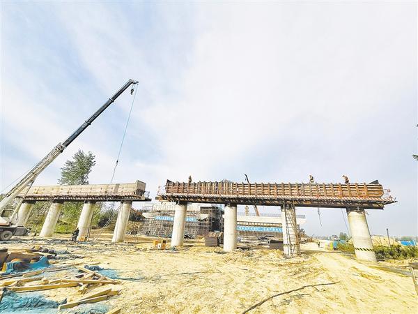 周口新北环线上正在建设的贾鲁河大桥,全长904米,横跨57米;主桥最大跨径130米,单跨长度位居周口市第一,也是目前我市在建的最长大桥。目前,该工程已完成桩基356根,墩柱106个 ,盖板、盖梁的浇筑正在紧张施工中。