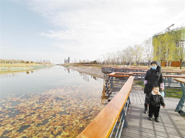 12月14日,市民在松花江路与腾飞路交叉口的休闲游园内的木栈道上游玩。市委、市政府对中心城区洼冲沟、流沙河、幸福河等水系治理己初见成效,中心城区市民的居住环境有了巨大改变,实现了河畅、水清、天蓝、景美。
