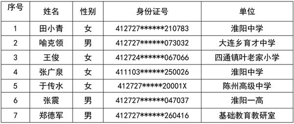 根据《事业单位人事管理条例》和《周口市淮阳区教师队伍管理办法》规定,经区纪监委派驻教体局纪检组核实,淮阳中学田小青等7位教师长期不在岗,区教育体育局党组研究决定,核减以下7名教师编制,现予公告。