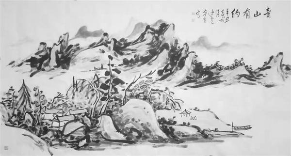 他画山水初学董其昌、沈周和元四家,后来迷上了黄宾虹。黄宾虹的山水画墨深淋漓、重叠不乱,用笔用墨丰富多变,更需要书法的底蕴,层层积墨,似乱而不乱,浓黑中见笔墨,气象万千。