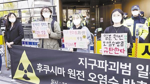 4月14日,韩国民众在位于首尔的日本驻韩国大使馆外集会,抗议日本政府将福岛核废水排入大海。