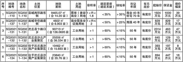 备注: SQ2021-110号:1.宗地“五通一平”(宗地外通路、通电、通讯、通上水、通下水,宗地内土地平整);2.依照河南省政府第200号令,该地块应按照其一次性规划新建或者新增地上总建筑面积的6%比例修建防护级别6级以上防空地下室;3.商业建筑面积所占比:<10%;4.由辖区政府负责按时向受让人交付土地。SQ2021-137号:1.宗地“五通一平”(宗地外通路、通电、通讯、通上水、通下水,宗地内土地平整);2.停车泊位指标:机动车:1个/100m2商业建筑面积,非机动车:6个/100m2商业建筑面积;3.依照河南省政府第200号令,该地块应按照其一次性规划新建或者新增地上总建筑面积的6%比例修建防护级别6级以上防空地下室;4.由辖区政府负责按时向受让人交付土地。Q2021-131号:1.宗地“五通一平”(宗地外通路、通电、通讯、通上水、通下水,宗地内土地平整);2.行政办公及生活服务设施用地不得超过工业项目总面积的5%;3.依照河南省政府第200号令,该地块应按照其一次性规划新建或者新增地上总建筑面积的6%比例修建防护级别6级以上防空地下室;4.准入行业:生物智能发电;5.由辖区政府负责按时向受让人交付土地。SQ2021-132号:1.宗地“五通一平”(宗地外通路、通电、通讯、通上水、通下水,宗地内土地平整);2.行政办公及生活服务设施用地不得超过工业项目总面积的5%;3.依照河南省政府第200号令,该地块应按照其一次性规划新建或者新增地上总建筑面积的6%比例修建防护级别6级以上防空地下室;4.准入行业:纺织业;5.沿宗地东边界建筑物不再退界;6.由辖区政府负责按时向受让人交付土地。SQ2021-133号:1.宗地“五通一平”(宗地外通路、通电、通讯、通上水、通下水,宗地内土地平整);2.行政办公及生活服务设施用地不得超过工业项目总面积的5%;3.依照河南省政府第200号令,该地块应按照其一次性规划新建或者新增地上总建筑面积的6%比例修建防护级别6级以上防空地下室;4.准入行业:仓储物流;5.由辖区政府负责按时向受让人交付土地。SQ2021-134号:1.宗地“五通一平”(宗地外通路、通电、通讯、通上水、通下水,宗地内土地平整);2.行政办公及生活服务设施用地不得超过工业项目总面积的5%;3.依照河南省政府第200号令,该地块应按照其一次性规划新建或者新增地上总建筑面积的6%比例修建防护级别6级以上防空地下室;4.准入行业:仓储物流;5.由辖区政府负责按时向受让人交付土地。