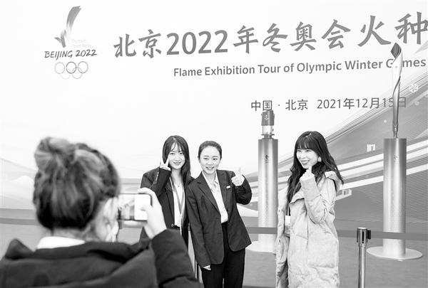 12月15日,在中国三峡集团展示活动现场,工作人员在北京冬奥会火种灯和火炬前留影。