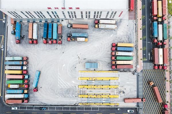 4月11日,满载着出口货物的集装箱车辆在吴兴织里港海关监管作业场等候通关(无人机照片)。近年来,浙江省湖州市吴兴区织里镇不断释放政策红利,该镇外贸出口步伐明显加快、产能快速释放。新华社记者 徐昱 摄