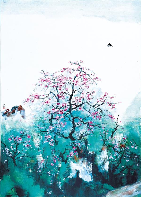 我在一幅画前驻足,与画对视,忽略了身边的人来人往。画中的几树繁花开在青山之间,开得很是热闹,让人想到桃花,看了一下画的名字:《又醉桃源鸟空啼》,果然可以理解成桃花。说是桃花,又不像是桃花,甚至,说是花,又不像是花,那团团簇簇的粉,不是花瓣形成的花朵,只是一片片在人面上慢慢化开了的胭脂。对视久了,却又觉得,似与不似之间,花还是花,生长在幽谷烟岚之中的花,生长在画家心中的花。
