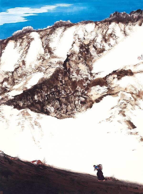 又何止是慢下来,在《天路》前,只能停下来。除了震撼,我一时不知该怎么形容自己初见这幅画的感受。那是一条神奇的天路,路上,有一个蓝衣女子在蓝天下背负着一个大大的筐前行,前行的路缓缓向上,远处是重重叠叠的雪山。那山,有大块的重重的墨色,和女子脚下的路一样厚重,大山与女子之间,是大片的留白,那留白,可以让人感受到路的漫长、雪的洁白,也可以让人感受到大山仿佛悬空向下的重压和力量,让人恍惚间以为女子肩上背的不只是筐,还有山。可是,整幅画面就是有一种力量,有一种被大山、被生活压不垮的力量,虽然那个女子在大山里显得那么渺小,但她倾身努力向上的侧影有着一种坚韧与顽强,她仿佛在向着蓝天走,向着白云走。雪山之上的蓝天白云,就在她的生活之上,那是她对幸福的向往和追寻。