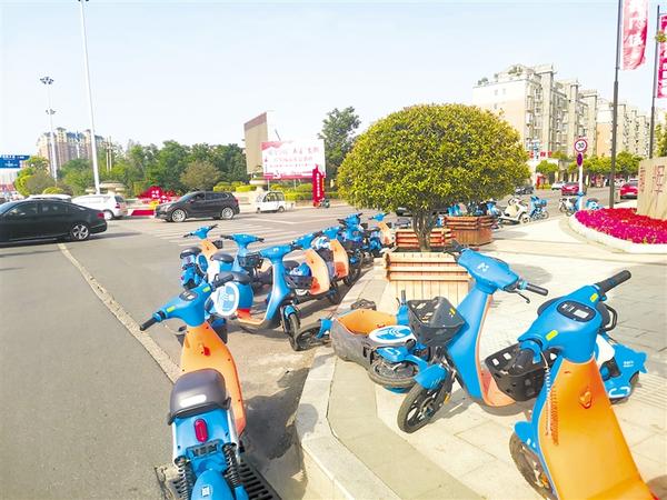 在中心城区中州大道融辉城大门前,共享单车在路口乱停乱放妨碍交通、影响出行,亟待加强管理。记者 李瑞才 摄