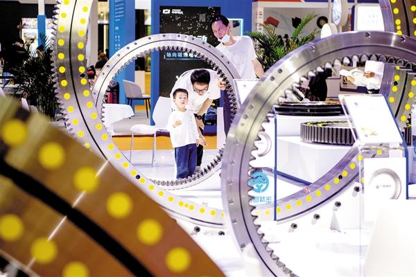 5月15日,在长沙国际会展中心,观众在参观展出的工程机械配件。