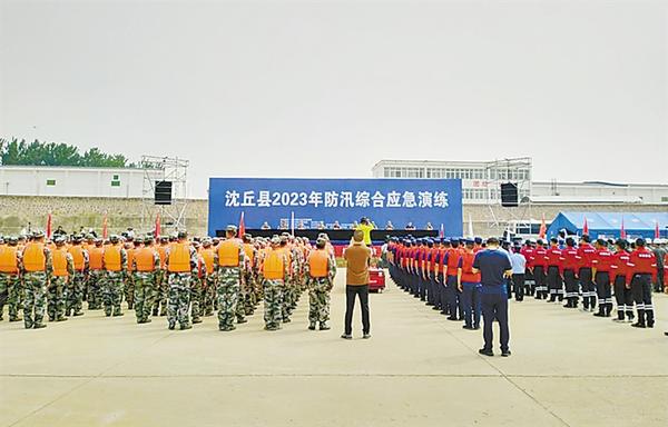 5月18日,沈丘县2023年防汛综合应急演练在中储粮沈丘直属库纸店镇码头举行。此次演练分为会商研判、紧急避险转移安置、巡堤查险中发现管涌和堤顶漫溢、抢险排涝、水上救援综合演练5个科目,出动“龙吸水”1部、消防车2辆、救护车1辆、应急发电车1辆、应急通信车2辆、无人机和冲锋舟各9个、应急抢险队伍14支、抢险队员600余人。演练结束后,沈丘县委常委、常务副县长、县防汛抗旱指挥部常务副指挥长张锐对此次演练进行点评总结。(记者 王凯 通讯员 马勇 摄)
