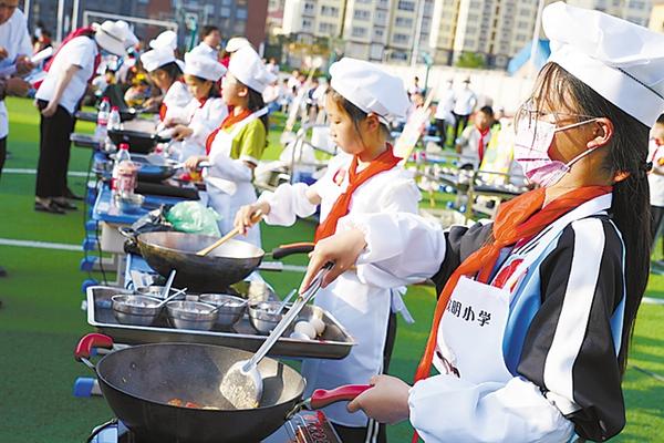 小学生现场比拼烹饪技巧。
