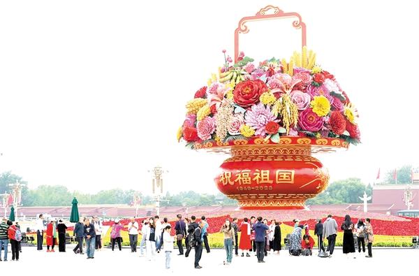 这是9月25日在北京天安门广场拍摄的“祝福祖国”巨型花篮。