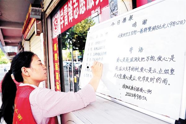 志愿者在版面上标注爱心粥屋当日运行情况。