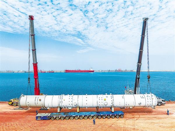 10月7日,在山东港口烟台港西港区,一件171吨重的设备被吊装上岸(无人机照片)。