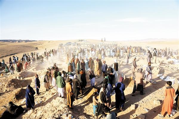10月9日,在阿富汗西部赫拉特省津达詹区,民众为悼念地震遇难者举办葬礼。