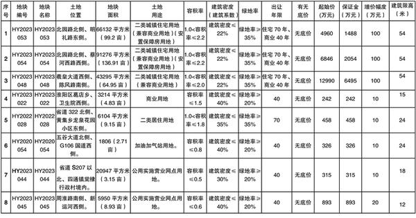 2.HY2023054号宗地兼容商业设施建筑面积不得超过地上总建筑面积10%,竞得人需配建幼儿园(托儿所),至少配建80个托位,建成后无偿移交政府,其他规划按《HY2023054号宗地的规划设计条件通知书》执行。土地成交价款需在土地出让合同签订后60日内缴清,12个月内必须开工建设,工期35个月,交地时间6个月内。