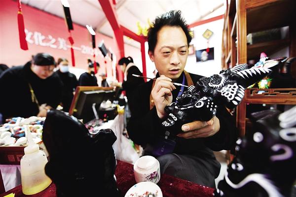 3月14日上午,在周口伏羲文化旅游节上的非遗展示馆内,淮阳泥泥狗艺人许品现场为泥泥狗彩绘,向游客展示古老庙会的图腾文化。 记者 梁照曾 摄