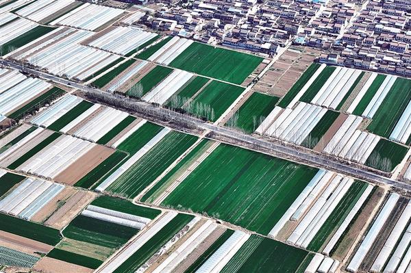 这是宝鸡市陈仓区东关街道的设施农业与麦田景色(3月13日摄,无人机照片)。 春耕备耕时节,陕西省宝鸡市农民和农技人员抢抓农时开展农业生产,田间、大棚里一派春日繁忙景象。新华社记者 邵瑞 摄