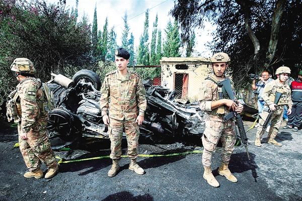3月13日,军人在黎巴嫩提尔的以军空袭现场警戒。 当日,以色列对黎巴嫩南部发动空袭,造成一名哈马斯官员和一名叙利亚公民死亡。新华社发(阿里·哈希绍摄)