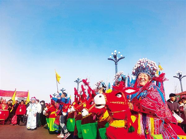 近日,一年一度的庙会开启,省内外的游客纷纷朝淮阳涌来,拜人祖、赏非遗、品美食,一个中国式的狂欢节在伏羲文化广场上激情上演。图为一支身着节日盛装的民俗表演队正兴致勃勃地表演。 记者 侯俊豫 摄